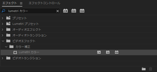 エフェクトパネルの検索窓に「Lumetri カラー」と入力して検索してみましょう。