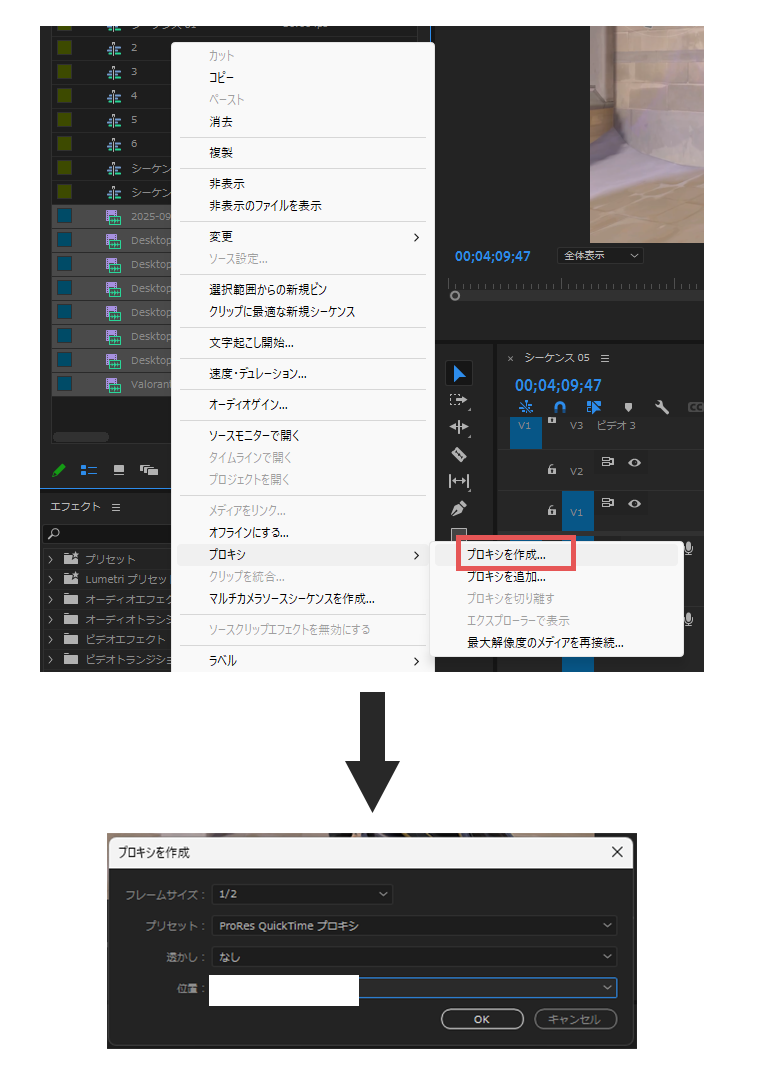 対処法:動画素材を選択して右クリック⇒プロキシの作成