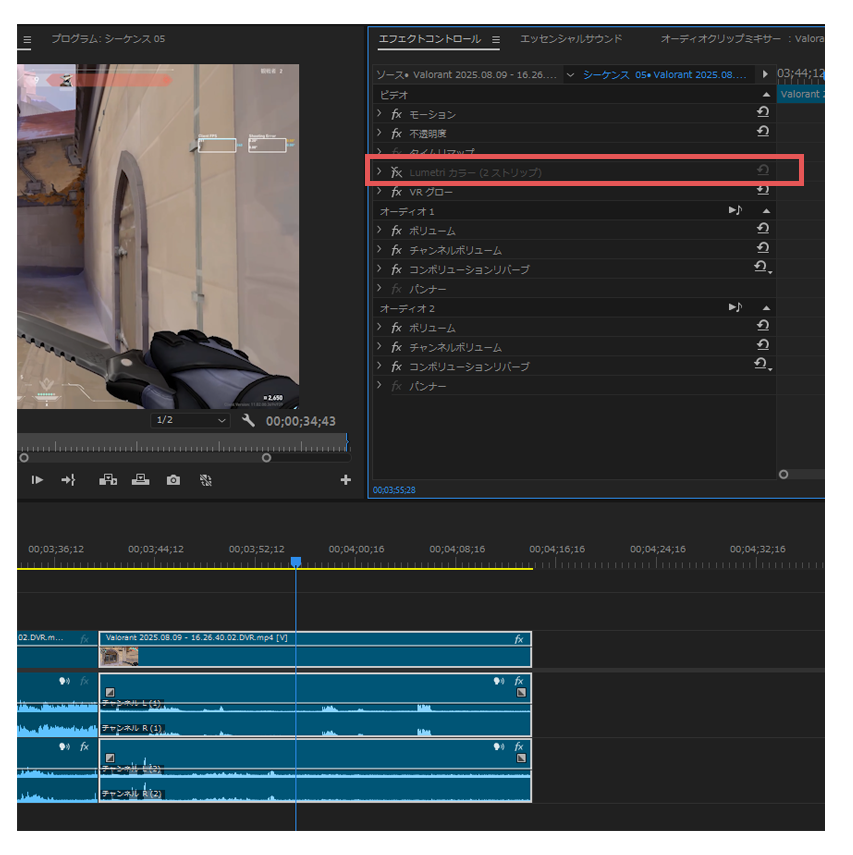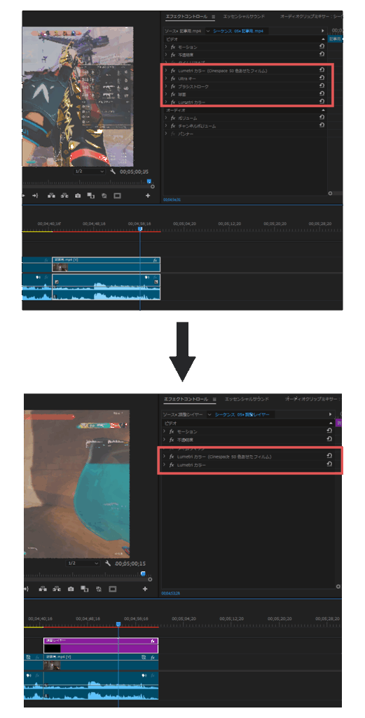 Lumetriカラーエフェクトは多重適用をせず1枚の調整レイヤーで一括処理にすることで、負荷を減らします。