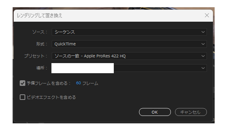 形式・プリセット・保存先を適宜変更し、OK押下でタイムライン上の該当カットが軽い中間ファイルに置き換わります。