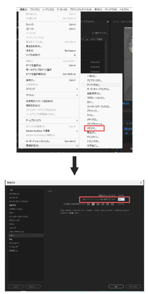 長時間編集で重い・応答なし | RAM枯渇 | 「他のアプリケーション用に確保するRAM」を減らす |