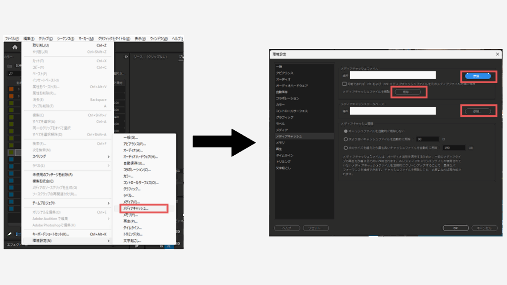 対処法:編集 > 環境設定 > メディアキャッシュ ⇒ 未使用キャッシュ削除・保存先をSSDへ変更