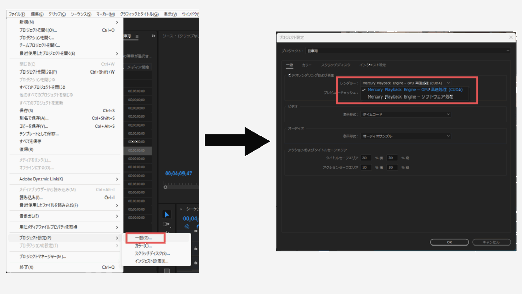 設定:ファイル > プロジェクト設定 > 一般 のレンダラーはMercury GPU加速、GPUドライバは安定版(例:NVIDIA Studio)に固定。