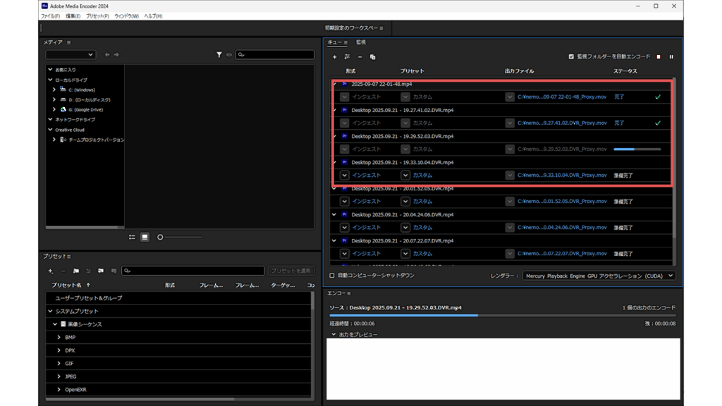 自動的にAdobe Media Encoderが立ち上がり、プロキシファイルへの変換が始まります。