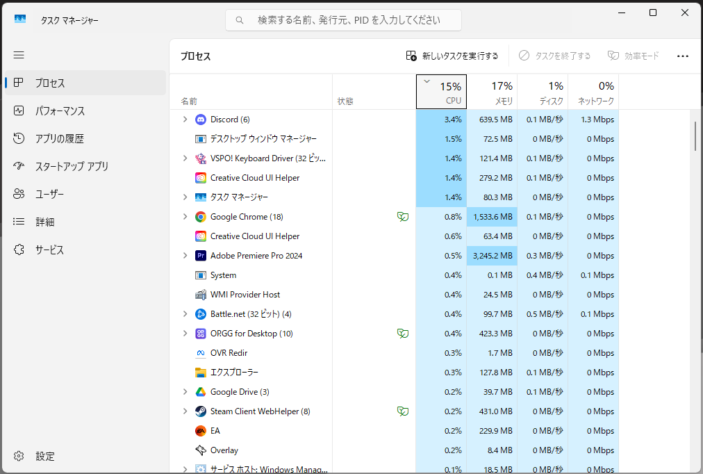 タスクマネージャーのプロセスタブでメモリ使用率を確認⇒使用率の高いアプリを終了するのもおススメです!
