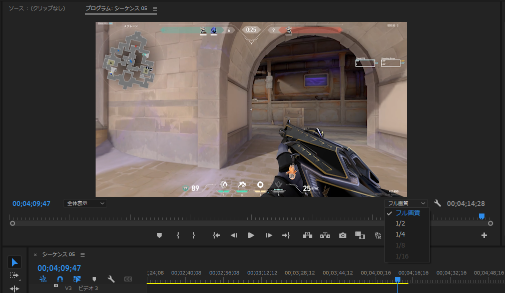 プログラムモニターの右下にあるドロップダウンモニターから「1/2」「1/4」を選択することで再生時の解像度を下げることができます。